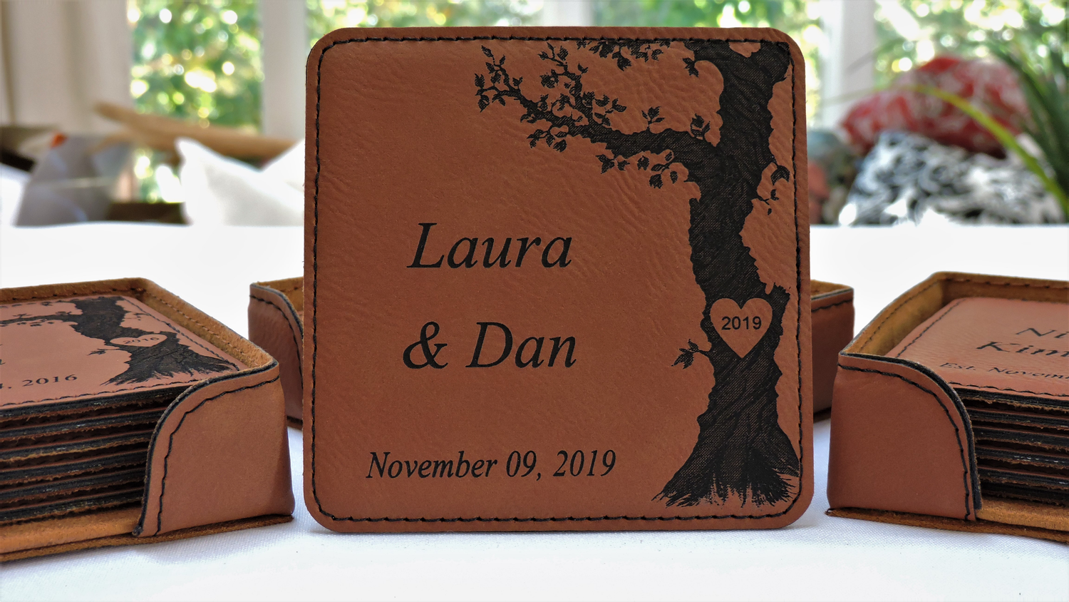 Coasters Personalized with Initials Carved in Heart and Wedding Anniversary Date- by Forever Me Gifts